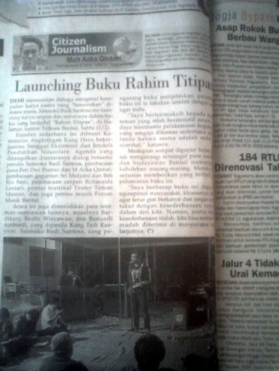 Potongan kliping koran Tribun Jogja pada Selasa 4 Februari 2014 yang memuat Citizen Journalism tentang edisi pertama Selasa Sastra Foto Dokumentasi Pribadi