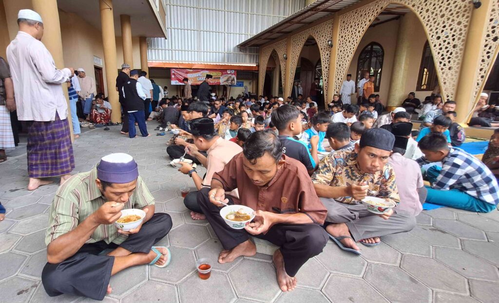 Bertempat di pelataran masjid Al-Istiqomah, ribuan warga yang terdiri dari jemaah masjid maupun masyarakat sekitar, nampak begitu menikmati hidangan makanan spesial yang telah disiapkan pihak panitia.