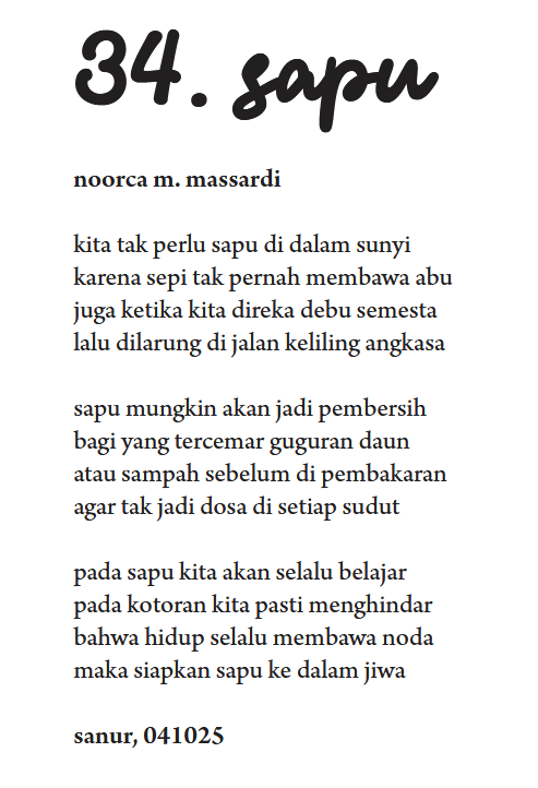 Pastilah kolom ini hanya mengantar saja, karena jika Anda membaca puisi Noorca secara langsung akan merasakan seberapa intens pergulatan domestik itu ia jalani hingga memancar dalam semburan diksi.