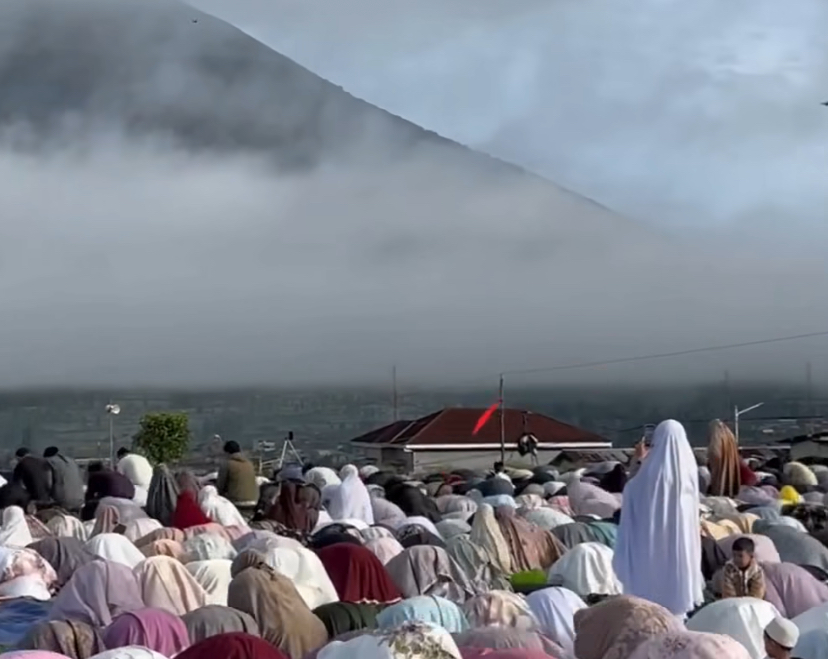 Ribuan warga memadati lapangan terbuka di Wonosobo untuk melaksanakan salat Id dengan latar pemandangan gunung yang diselimuti kabut tipis, menciptakan suasana sejuk dan khusyuk yang memukau.