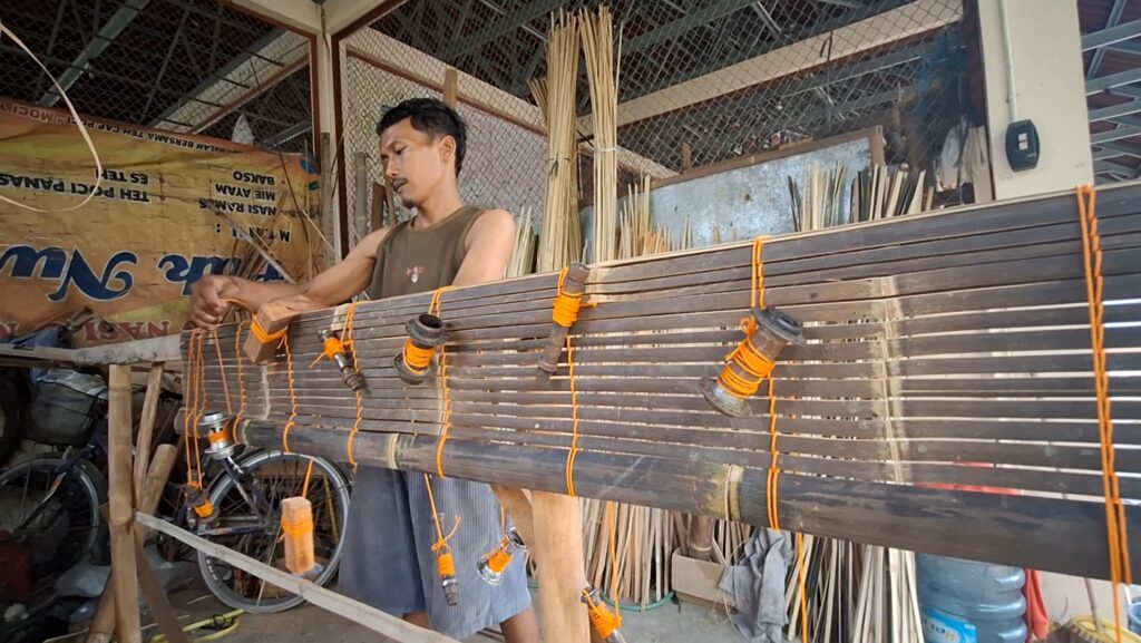 Alain Yanto (47) warga Lendah menjadi satu dari sedikit perajin lokal yang konsisten memproduksi kerai bambu secara manual. Selama lebih dari 10 tahun, Yanto aktif mengolah bahan alam berupa bambu wulung menjadi tirai dengan peralatan sederhana buatannya sendiri.